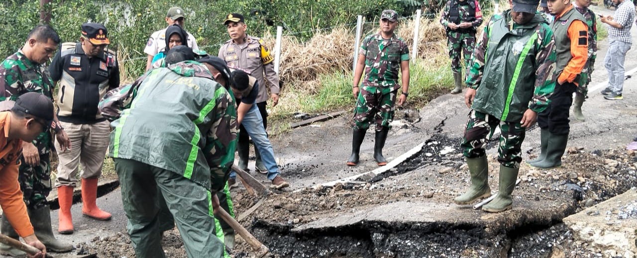 Lima Puluh Kota—Komandan Kodim (Dandim) 0306/50 Kota Letkol Inf Ucok Namara S,IP bersama Wakil Bupati 50 Kota Ahlul Badrito Resha meninjau lokasi tanah longsor di Jorong Aia Angek Nagari Koto Tinggi Kecamatan Gunung Omeh. Jumat (28/11/2025).