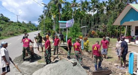 JAYAPURA – Personel Pos Ramil Tami Satgas Pamtas RI-PNG Yonif 131/Brs bersama warga membenahi halaman dan memperbaiki jembatan Gereja GKI Nehemia Skouw