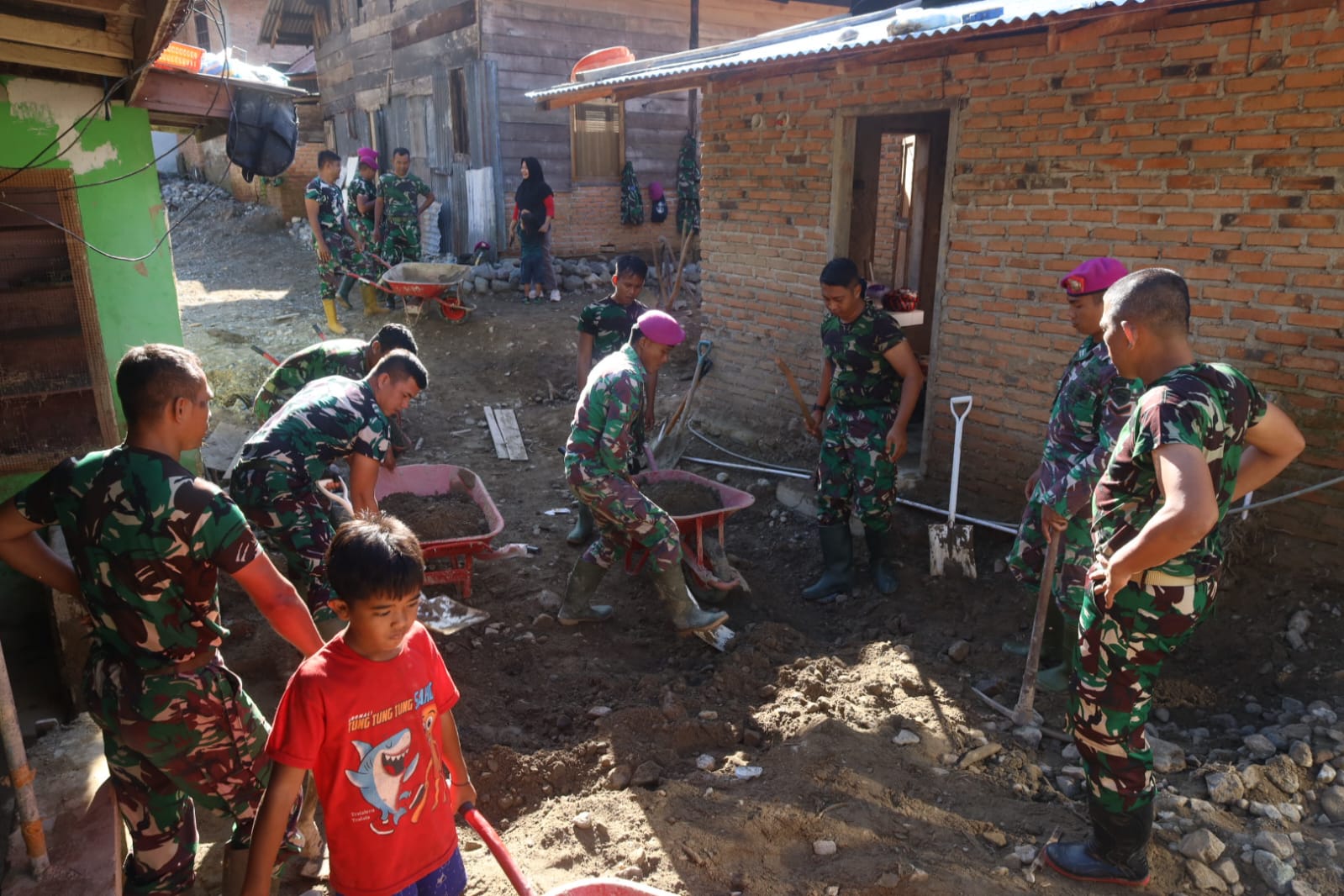 Para prajurit dengan semangat tinggi terus berjikabu mencoba membersihkan sisa sisa lumpur dan material lainnya di Tanjung Raya Kecamatan Maninjau Kabupaten Agam.Kegiatan ini telah dilaksanakan sejak awal terjadinya bencana.
